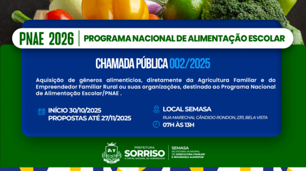 A Secretaria Municipal de Agricultura Familiar e Segurança Alimentar de Sorriso(SEMASA) abriu nesta quinta-feira (30) a Chamada Pública nº 002/2025 para a aquisição de gêneros alimentícios da Agricultura Familiar e do Empreendedor Familiar Rural, destinados ao Programa Nacional de Alimentação Escolar (PNAE) de 2026.