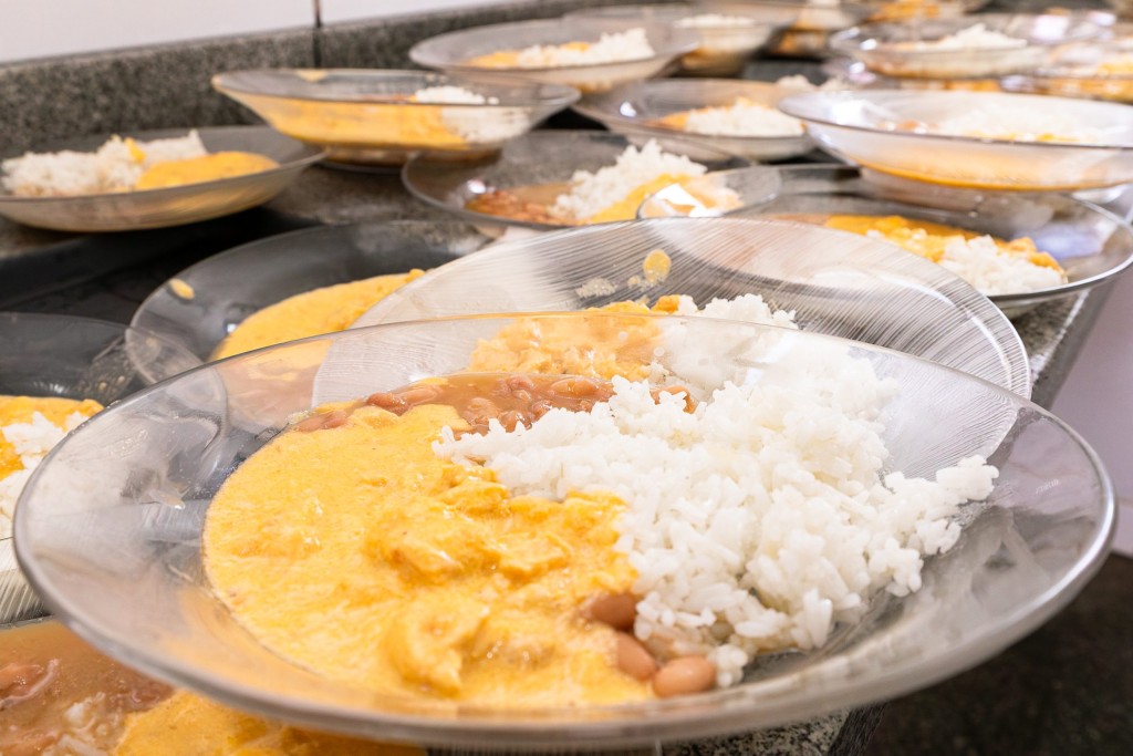 A foto ilustra um prato preenchido com arroz, feijão e frango com molho em um ambiente de cozinha escolar