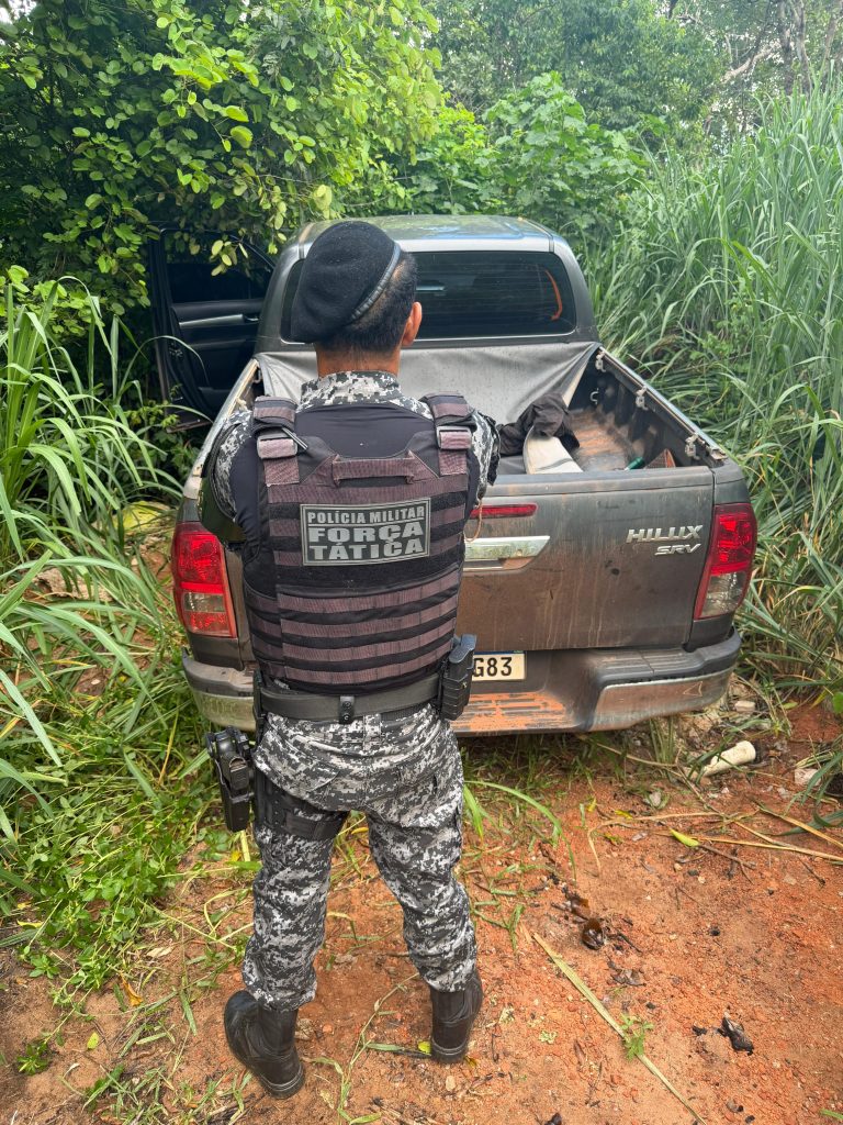 Com essas informações, as equipes da Força Tática reforçaram as rondas em diferentes regiões de Rondonópolis. Durante o patrulhamento na zona rural, os policiais localizaram a caminhonete abandonada em uma área de mata, sem ninguém por perto.