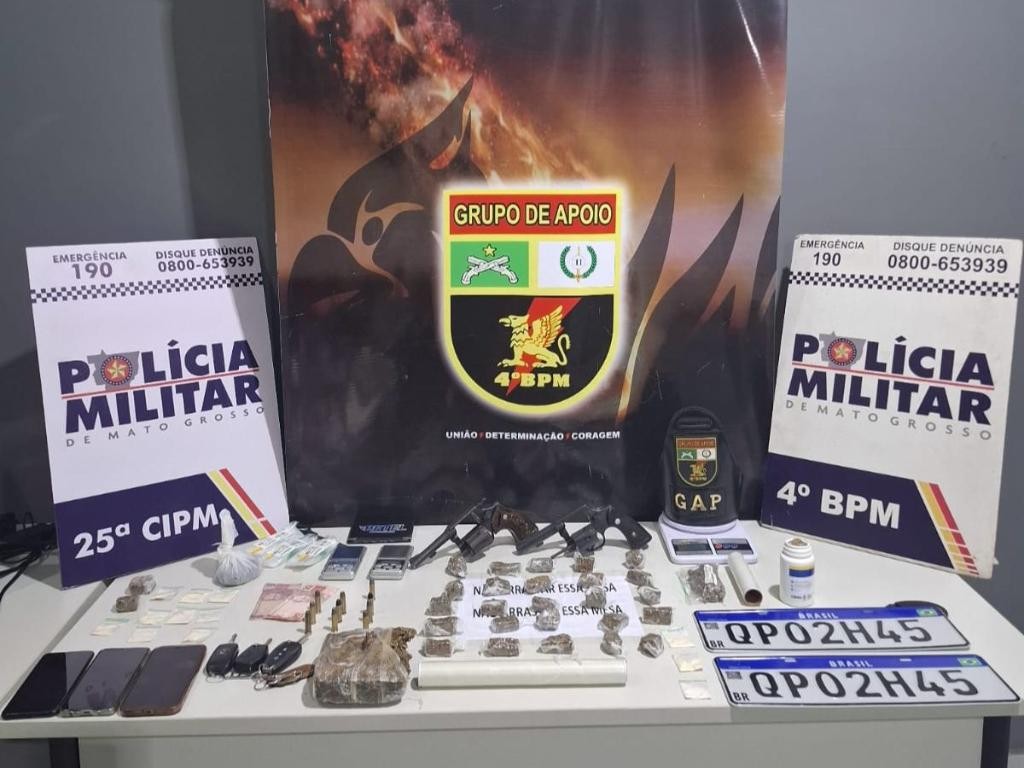 Com o primeiro homem detido, a PM encontrou um revólver de calibre .38 com cinco munições. Já com os dois suspeitos, detidos dentro da casa, os policiais localizaram mais um revólver de calibre .38, porções de maconha e cocaína, duas placas de carro e a chave de um carro Chevrolet Prisma.