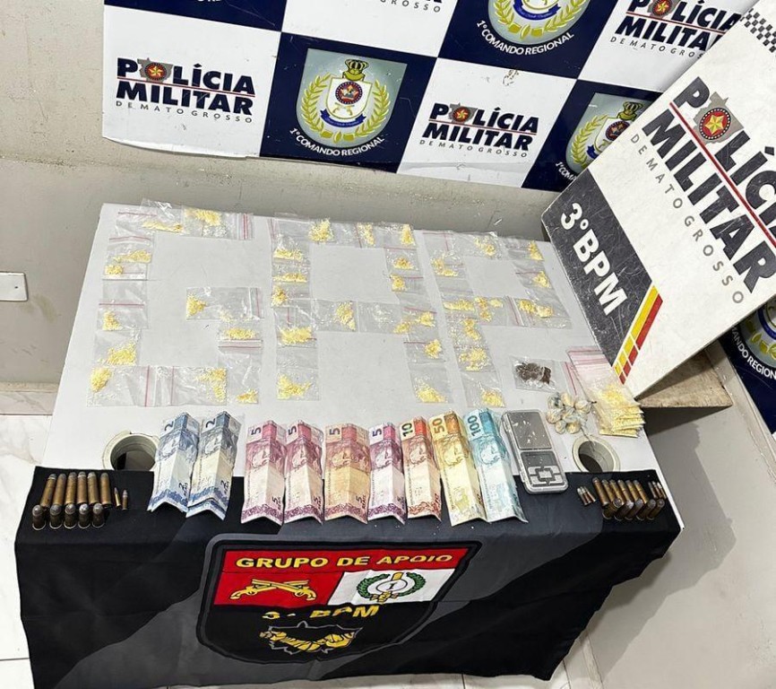 Em buscas, os policiais encontraram uma porção de maconha e 58 porções de pasta base, além de cinco munições de calibre .44, oito munições calibre .22, 17 munições de calibre .38 e uma quantia de R$ 65 em notas trocadas. Os suspeitos receberam voz de prisão.