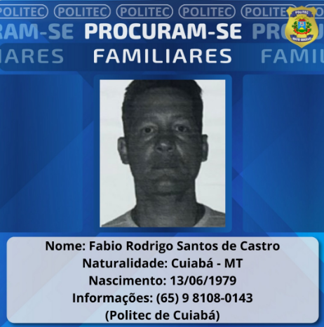 A Gerência de Medicina Legal da Politec está à procura de familiares de Fábio Rodrigo Santos de Castro, natural de Cuiabá. Ele nasceu em (13/06/1979) e, até o momento, não houve a localização de parentes.