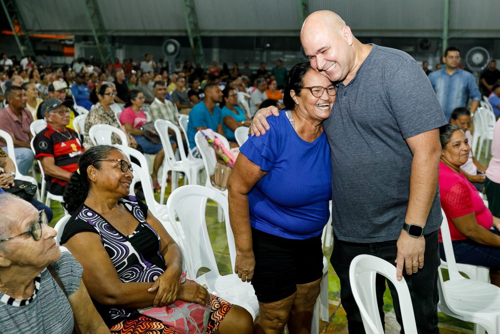 A imagem mostra o prefeito Abilio, de camisa cinza, abraçando uma mulher, de camisa azul. Ao fundo, há uma plateia com centenas de pessoas sentadas em uma quadra poliesportiva. O local é onde houve o evento.