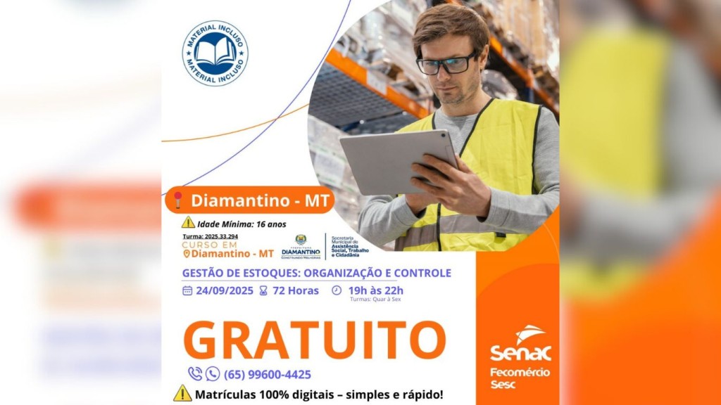 A Prefeitura de Diamantino, por meio da Secretaria Municipal de Assistência Social, Trabalho e Cidadania, em parceria com o SENAC, informa que estão abertas as inscrições para o curso Gestão de Estoques: Organização e Controle.