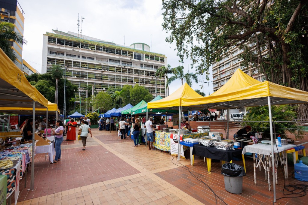 A foto mostra uma das edições da feira já realizada na Praça Alencastro. Há barracas dispostas pelo local com dezenas de comerciantes, em frente à sede da Prefeitura de Cuiabá.