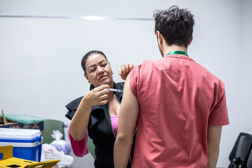 A foto ilustra uma enfermeira aplicando uma injeção no braço esquerdo de um homem, que está de costas e vestido com camisa vermelha clara.